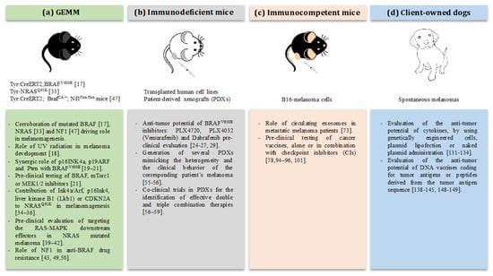 Most relevant achievements in the melanoma onco-immunology field obtained in (a) genetically engineered mouse models (GEMM); (b) immunodeficient mice xenotransplanted with human cell lines or patient-derived tumors (PDXs); (c) immunocompetent mice challenged with syngeneic B16 cells; (d) canine patients affected by spontaneous melanoma.