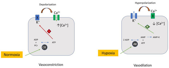 K-ATP channels and vascular tone. ATP-sensitive potassium (KATP) channels are cell membrane metabolic sensors that affect membrane excitability depending on the cellular energetic status. In normal conditions, the CK pathway is much more expressed than the AK one. A sufficient intracellular ATP concentration keeps the KATP channel closed. Hypoxia determines the activation of the AK pathway with an increase of AMP-K which opens the KATP channels. A K+ outflow causes hyperpolarization and, consequently, Ca2+ channel closing. The low intracellular Ca2+ concentration causes vasodilation. AK: Adenylate kinase ADP: Adenosine diphosphate; AMP-K: AMP-activated protein kinase; CK: Creatine kinase; PCr: Phosphocreatine.