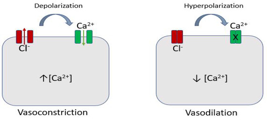 Chloride channels expressed in the vascular smooth muscle cells can be voltage or Ca2+ dependent. By opening these channels, Cl− ions move out of the cells and, depolarizing them, have a vasoconstriction effect; the opposite occurs when they are closing (Figure 2).