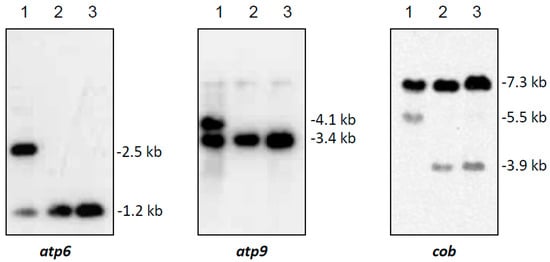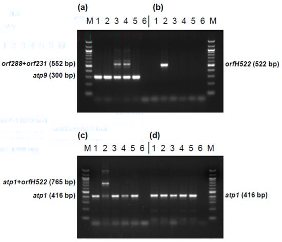 - Liu, X.-L.; Zhang, S.-W.; Duan, J.-Q.; Du, G.-H.; Liu, F.-H. Mitochondrial genes atp6 and atp9 cloned and characterized from ramie (Boehmeria nivea (L.) Gaud.) and their relationship with cytoplasmic male sterility. Mol. Breed. 2012, 30, 23–32. [Google Scholar] [CrossRef]