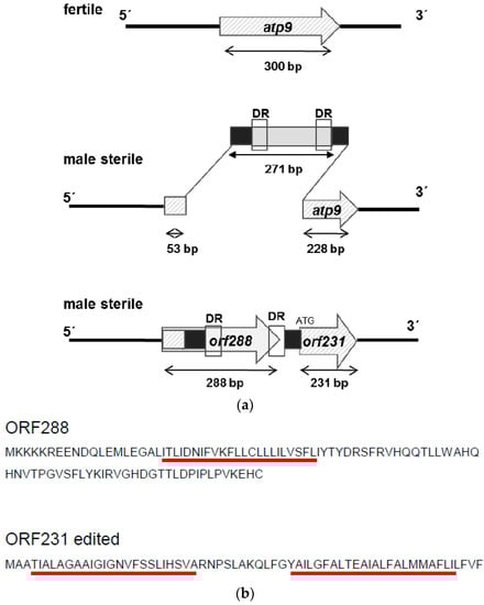 - Köhler, R.H.; Horn, R.; Lössl, A.; Zetsche, K. Cytoplasmic male sterility in sunflower is correlated with the co-transcription of a new open reading frame with the atpA gene. Mol. Gen. Genet. 1991, 227, 369–376. [Google Scholar] [CrossRef] [PubMed]