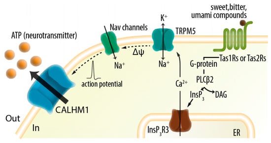 - Taruno, A.; Vingtdeux, V.; Ohmoto, M.; Ma, Z.; Dvoryanchikov, G.; Li, A.; Adrien, L.; Zhao, H.; Leung, S.; Abernethy, M.; et al. CALHM1 ion channel mediates purinergic neurotransmission of sweet, bitter and umami tastes. Nature 2013, 495, 223–226. [Google Scholar] [CrossRef] [PubMed]