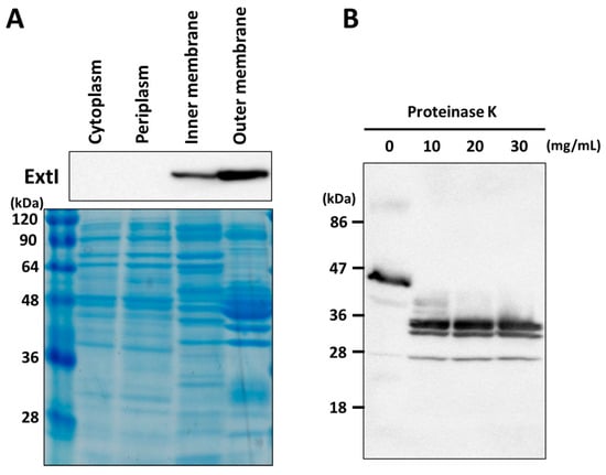 Cellular localization of ExtI. (A) Subcellular fractionation and Western blotting. Each cellular fraction was isolated, and the localization of ExtI was analyzed by Western blotting (upper panel). A Coomassie-stained gel is shown as the loading control (lower panel). The numbers at the left indicates the sizes of the marker proteins in kDa; (B) the effects of proteinase K treatment on ExtI integrity. Cells were treated with different concentrations (0 to 30 mg/mL) of proteinase K to analyze the surface exposure of ExtI, and the degraded products were analyzed by Western blotting.
