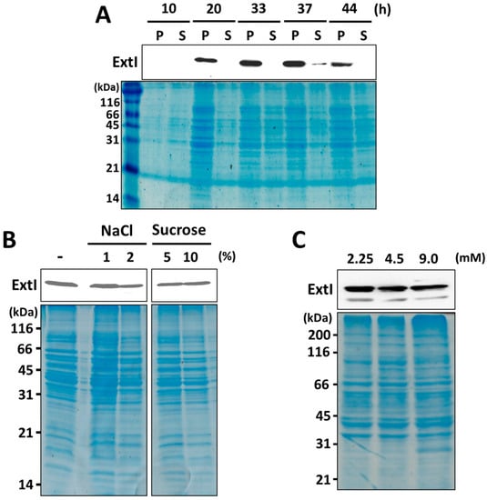 SDS-PAGE analyses were performed using 12% polyacrylamide gels. Proteins were stained with Coomassie Brilliant Blue R-250. Western blotting was performed using polyvinylidene difluoride membranes (Invitrogen, Carlsbad, CA, USA) and an iBlot Dry Blotting System (Invitrogen, Carlsbad, CA, USA), according to the manufacturer’s instructions. For ExtI detection, a polyclonal antibody raised against a synthetic peptide (ISKTDFDKEGTYNG) corresponding to a partial sequence of ExtI was used (Eurofins Genomics, Tokyo, Japan). Immunoreactive proteins were detected using the Super Signal West Femto Maximum Sensitivity Substrate reagent (Thermo Fisher Scientific, Waltham, MA, USA) and a Lumino image analyzer LAS-4000 (Fujifilm, Tokyo, Japan).