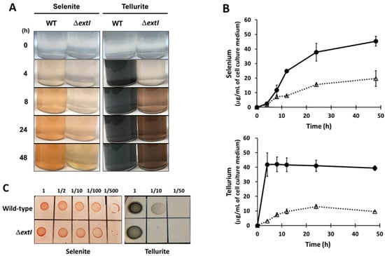 2.6. ExtI Deficiency Affects the Conversion of Selenite/Tellurite to Se0/Te0