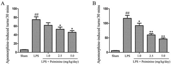 Peiminine improves LPS-induced motor dysfunction. Rats were pretreated with peiminine (1.0, 2.5 or 5.0 mg/kg/day) for three days prior to the intranigral injection of LPS for 28 days. The number of turns induced by apomorphine after two weeks (A) and four weeks (B) in the LPS-induced PD rat model is shown (n = 8 rats per group). ## p < 0.01 compared to the sham group, * p < 0.05 and ** p < 0.01 compared to the LPS groups.