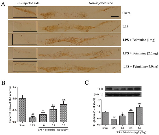 Tyrosine hydroxylase (TH) is a rate-limiting enzyme that is broadly expressed in dopaminergic neurons for the synthesis of catecholamines, which are required for dopamine production [22]. Consequently, the amount of TH reflects the extent of dopaminergic neuronal loss in the SNpc. Immunohistochemical staining revealed a dramatic decrease in the number of TH-positive cells in the LPS group compared with that in the sham group, and peiminine attenuated the LPS-induced loss of TH-positive cells in a dose-dependent manner (Figure 2A,B). To further investigate the protective effects of peiminine on dopaminergic neurons, we examined levels of the TH protein in the SNpc. The Western blotting results indicated that peiminine significantly increased the LPS-induced decease in the level of the TH protein in the SNpc of model rats in a dose-dependent manner (Figure 2C). Based on these data, peiminine protected dopaminergic neurons in the LPS-induced PD rat model.