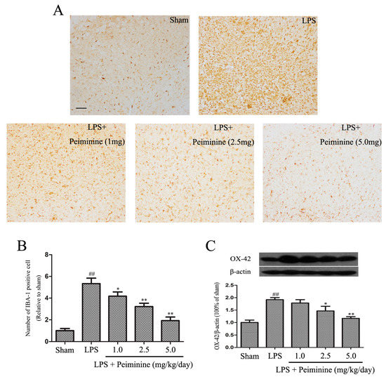 Microglial activation is associated with the loss of dopaminergic neurons in the LPS-induced PD rat model [23]. IBA-1 is a marker of microglial activation and has been used to analyse the degree of microglial activation [21]. Hence, the number of IBA-1-positive cells reflects the percentage of activated microglia. Compared with the sham group, LPS significantly increased the number of IBA-1-positive cells in the SNpc, and the remaining ramified microglia were transformed into an amoeboid morphology. Peiminine dramatically decreased the number of IBA-1-positive cells in a dose-dependent manner (Figure 3A,B). Next, we measured the expression of another well-known marker of activated microglia, CD11b (OX-42) [24]. The Western blot results showed marked increase in OX-42 levels following treatment with LPS, and the peiminine treatment significantly decreased OX-42 expression in a dose-dependent manner (Figure 3C).