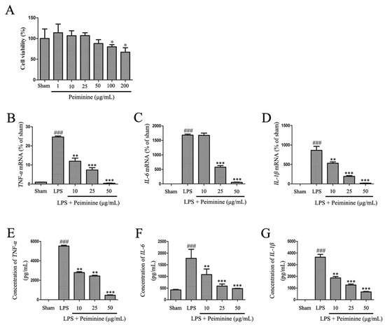 Peiminine inhibits the LPS-induced inflammatory response in BV-2 cells. (A) The effects of peiminine (1, 10, 25, 50, 100 and 200 μg/mL) on the viability of BV-2 cells. BV-2 cells were pretreated with various concentrations of peiminine (10, 25 or 50 μg/mL) for 1 h, then stimulated with LPS for 4 h. The expression of the TNF-α (B), IL-6 (C) and IL-1β (D) mRNA was determined using quantitative real-time PCR (n = 3). Cells were pretreated with various concentrations of peiminine (10, 25 or 50 μg/mL) for 1 h, stimulated with LPS for 12 h, and the levels of the TNF-α (E), IL-6 (F) and IL-1β (G) proteins in media supernatants were measured using ELISA (n = 3). ### p < 0.001 compared to the sham group, * p < 0.05 compared to the sham group, ** p < 0.01 and *** p < 0.001 compared to the sham group.