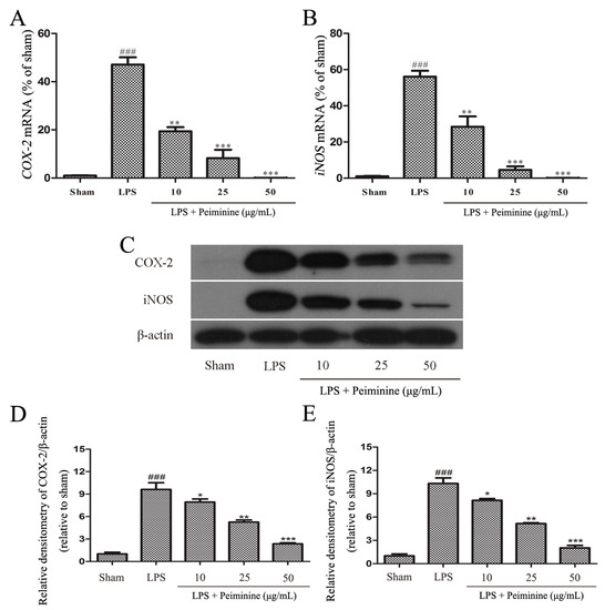 Peiminine inhibits the LPS-induced inflammatory response in BV-2 cells. BV-2 cells were pretreated with peiminine (10, 25 or 50 μg/mL) for 1 h and then stimulated with LPS for 4 h. (A,B) The expression of the iNOS and COX-2 mRNAs was examined by quantitative real-time PCR (n = 3); (C–E) levels of the iNOS and COX-2 proteins were measured by Western blotting (n = 3). ### p < 0.001 compared to the sham group, * p < 0.05, ** p < 0.01 and *** p < 0.001 compared to the LPS group.