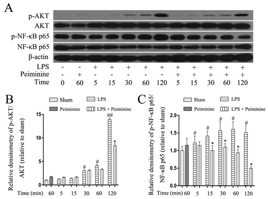 Peiminine suppresses the LPS-induced phosphorylation of NF-κB p65 in BV-2 cells. Cells were pretreated with peiminine (50 μg/mL) for 1 h and then stimulated with LPS (1 μg/mL) for 5, 15, 30, 60 or 120 min. Western blot results (A) (n = 3). Peiminine inhibited the LPS-induced phosphorylation of NF-κB p65 and AKT (B,C). # p < 0.05 and ## p < 0.01 compared to the sham group, * p < 0.05 compared to the LPS group at the same time point.