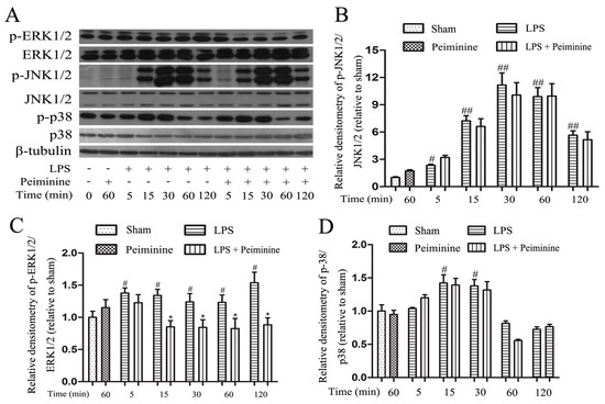 Peiminine suppresses LPS-induced ERK1/2 phosphorylation in BV-2 cells. Cells were pretreated with peiminine (50 μg/mL) for 1 h and then stimulated with LPS (1 μg/mL) for 5, 15, 30, 60 or 120 min. Western blot results (A) (n = 3). Peiminine inhibited LPS-induced ERK1/2 phosphorylation (C), but failed to inhibit the phosphorylation of JNK1/2 and p38 (B,D). # p < 0.05 and ## p < 0.01 compared to the sham group, * p < 0.05 compared to the LPS group at the same time point.