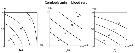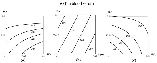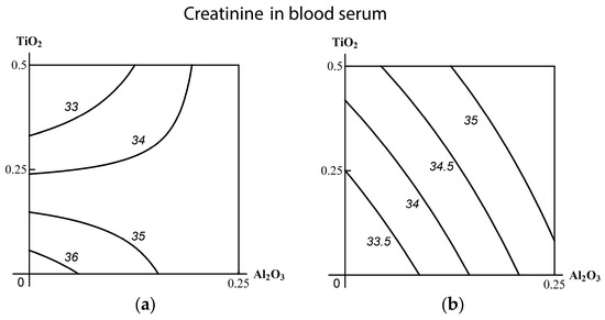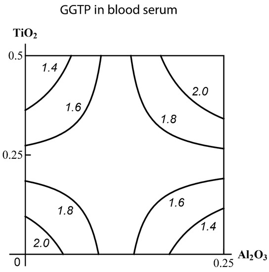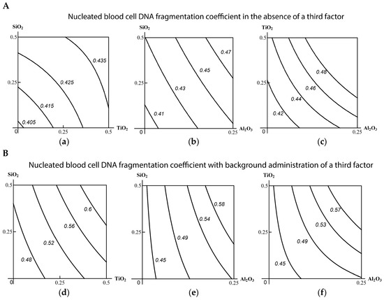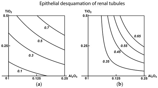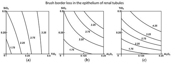 Thus, even a descriptive analysis of the tissue imprint cytology data points again to a probable ambiguity of combined toxicity type for various organs and cells. This tentative statement was confirmed by RSM-based mathematical modeling. Typical results of this modeling are exemplified by several isoboles obtained for two combinations: Al2О3-NP+SiO2-NP (Figure S4) and Al2О3-NP + ТiO2-NP (Figure S5) (see the Supplementary Materials).