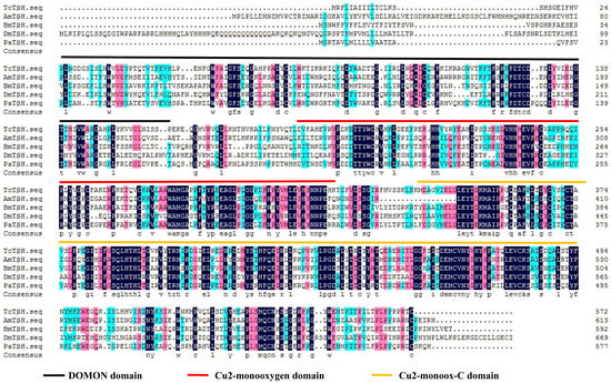 Figure 1. Multiple sequence alignment of TcTβH from four insect species: Apis mellifera (AmTβH), Drosophila melanogaster (DmTβH), Bombyx mori (BmTβH) and Periplaneta americana (PaTβH), by DNAMAN. The three different color lines represent the conserved domains, the black line is the DOMON domain, the red line the Cu2-monooxygen domain and the yellow line the Cu2-monoox-C domain. The information on TβH in these species is listed in Table S2.