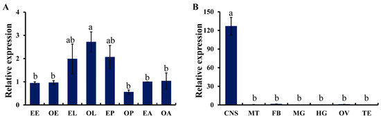 Figure 3. The expression profiling of TcTβH. (A) Relative expression levels of TcTβH at different developmental stages. The first letters, E and O represent early and old. Different stages are displayed by capitalized letters: E (egg), L (larva), P (pupa), and A (adult). The expression of EA served as the calibrator; (B) Relative expression levels of TcTβH in various tissues of adults. CNS: central nervous system; FB: fat body; MG: midgut; MT: Malpighian tubules; OV: ovary; TE: testis. The data shown are the mean of the relative expression ± standard error (S.E.) (n = 3), normalized to RPS3 transcript levels. Different letters (a, ab, b) above the bar represent a significant difference after ANOVA (least significant difference, LSD, p < 0.05).