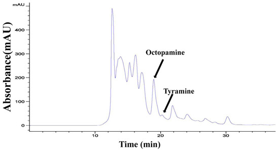 Figure 4. The prominent peak retention time of samples by HPLC with a C30 column. The black arrows are octopamine and tyramine.