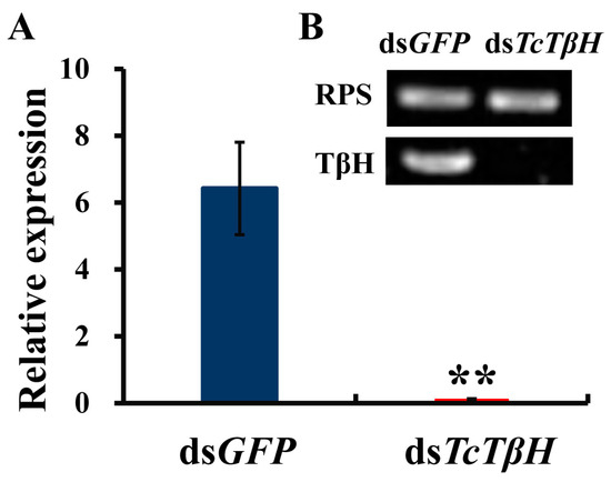 Figure 5. The RNA interference (RNAi) of TcTβH. (A) The RNAi efficiency was tested by qRT-PCR (the result comes from software of qbase). Data were obtained by analyzing three independent groups of four individuals (two females; two males) per group; (B) The confirmation of RNAi efficiency by RT-PCR. Double asterisks represent a significant difference by an independent t test (n = 3, **, p < 0.01), the target gene of TcTβH was carried out with 32 cycles and the reference gene TcrpS was carried out with 27 cycles.