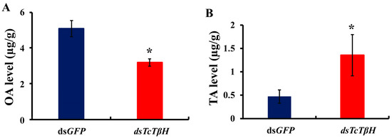 Figure 6. The level of octopamine (OA) and tyramine (TA) by HPLC. (A) The detection of the OA level by HPLC after RNAi; (B) The detection of the TA level by HPLC after RNAi. The asterisk represents a significant difference by an independent t test (n = 3, *, p < 0.05).