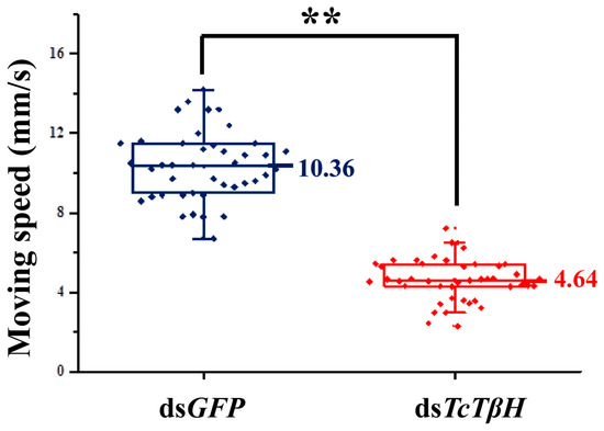 Figure 7. Effect of RNAi of TcTβH on the crawling speed (in millimeters per second) of T. castaneum. The red box plot shows the moving speed of double-stranded RNA (dsRNA)-treated adults, while the blue box plot shows the controls. Double asterisks represent a significant difference by an independent t test (n = 100, **, p < 0.01).
