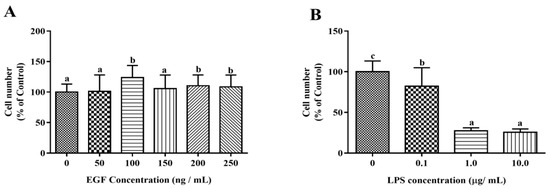 Cell numbers was evaluated using a CCK-8 assay. IPEC-J2 cells were seeded in 96-well plates (1 × 104/well) and cultured in DMEM/F12 with 10% FBS and 1% antibiotics for 24 h. Cells were treated with EGF at concentrations of 0, 50, 100, 150, 200, 250 ng/mL, or treated with LPS at concentrations of 0, 0.1, 1.0, 10 μg/mL for 24 h, then added 10 mL CCK-8 reagent, further cultured for 3 h, then measured the optical density (OD) at a wavelength of 450 nm used an enzyme-linked immune detector (Bio-Rad, Hercules, CA, USA). Cell numbers are presented as the percent of control cells. Experiments were performed in 6 times.