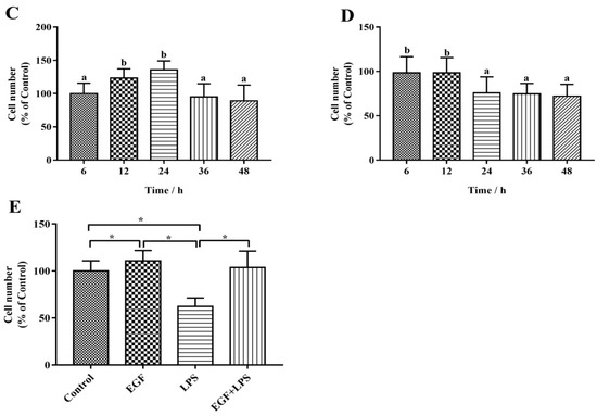 IPEC-J2 cells were seeded in 96-well plates (1 × 104/well) and cultured in DMEM/F12 with 10% FBS and 1% antibiotics for 24 h. Cells were treated with EGF at concentrations of 100 ng/mL, or treated with LPS at concentrations of 1.0 μg/mL (determined by toxicity experiment) for 6, 12, 24, 36, 48 h, then added 10 mL CCK-8 reagent respectively, further cultured for 3 h, then measured the OD at a wavelength of 450 nm used an enzyme-linked immune detector (Bio-Rad, Hercules, CA, USA). Cell numbers are presented as the percent of control cells. Experiments were performed in 6 times.