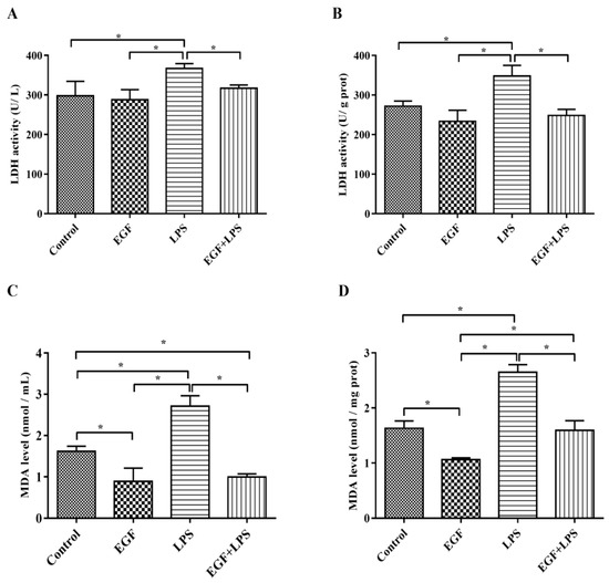 IPEC-J2 cells were seeded in 6-well plates (1 × 105/well) and cultured in DMEM/F12 with 10% FBS and 1% antibiotics for 24 h, then IPEC-J2 cells were treated for 24 h with: (1) EGF (0 ng/mL) + LPS (0 μg/mL) (Control group); (2) EGF (100 ng/mL) + LPS (0 μg/mL) (EGF group); (3) EGF (0 ng/mL) + LPS (1 μg/mL) (LPS group); and (4) EGF (100 ng/mL) + LPS (1 μg/mL) (EGF + LPS group). After a 24 h of incubation, 1.0 mL cell supernatant was collected and stored at −20 °C until analysis. Cells in 6-well culture plates were gently washed with PBS for twice, then RIPA Lysis Buffer R2220 (containing 1% PMSF) was used to lyse IPEC-J2 cells according to the instructions of the manufacturer. Cellular protein was determined using the bicinchoninic acid (BCA) protein assay reagent. The determination of LDH levels used LDH assay kit (A020-2) from Nanjing Jiangcheng Biotechnology Institute as previously reported [50]. The determination of MDA levels used MDA assay kit (A003-2) from Nanjing Jiangcheng Biotechnology Institute as previously reported [51]. Experiments were performed in 6 times.