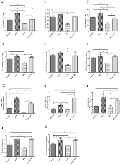 The results showed that in IPEC-J2 cells challenged with LPS, T-AOC, CAT, GSH-Px and SOD in cells and supernatants were significantly reduced (p < 0.05). While cells treated with EGF plus LPS significantly increased the T-AOC (Figure 3J,K), CAT (Figure 3A,D), GSH-Px (Figure 3B,E) and SOD (Figure 3C,F) levels compared to cells treated LPS (p < 0.05). RT-PCR results showed that there was an increase (p < 0.05) in the expression of CAT (Figure 3G), GSH-Px (Figure 3H) and SOD2 (Figure 3I) genes in cells treated with EGF, and EGF plus LPS compared to cells treated with LPS.