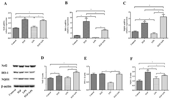 The expression of Nrf2-related genes (Nrf2, HO-1 and NQO1) and abundances of Nrf2, HO-1 and NQO1 proteins are illustrated in Figure 4. Results showed that cells treated with EGF plus LPS had higher (p < 0.05) Nrf2 (Figure 4A), HO-1 (Figure 4B) and NQO1 (Figure 4C) expression than cells treated with LPS. In accordance with above, EGF increased (p < 0.05) the protein level of Nrf2 (Figure 4D), HO-1 (Figure 4E), and NQO1 (Figure 4F) when cells were exposed to LPS. These data suggested that EGF would enhance Nrf2 protein expression and upregulate the expression of phase II metabolizing enzymes (such as HO-1 and NQO1) and antioxidative enzymes (SOD, CAT and GSH-Px) to alleviate LPS-induced oxidative injury.
