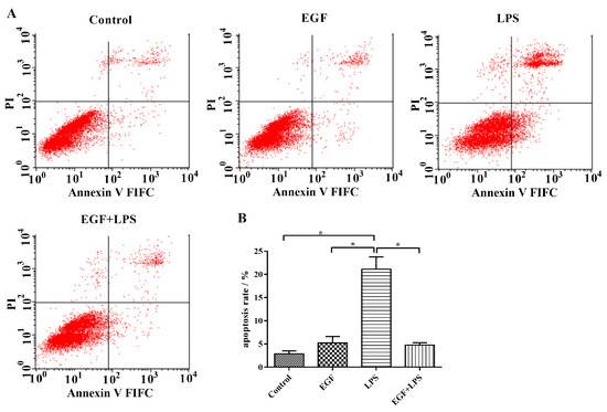 IPEC-J2 cells were seeded in 6-well plates (1 × 105/well) and cultured in DMEM/F12 with 10% FBS and 1% antibiotics for 24 h, then IPEC-J2 cells were treated for 24 h with: (1) EGF (0 ng/mL) + LPS (0 μg/mL) (Control group); (2) EGF (100 ng/mL) + LPS (0 μg/mL) (EGF group); (3) EGF (0 ng/mL) + LPS (1 μg/mL) (LPS group); and (4) EGF (100 ng/mL) + LPS (1 μg/mL) (EGF + LPS group). After a 24 h of incubation, collected cells were costained with 10 μM Annexin V-FITC and propidium iodide (PI) (Annexin V-FITC/PI kits) for 15 min at room temperature in the dark. Apoptotic cells were identifed using a BD FACSCalibur flow cytometer (BD Biosciences, San Diego, CA, USA). The data were analyzed using the sofware CELLQuest. Experiments were performed in triplicate.