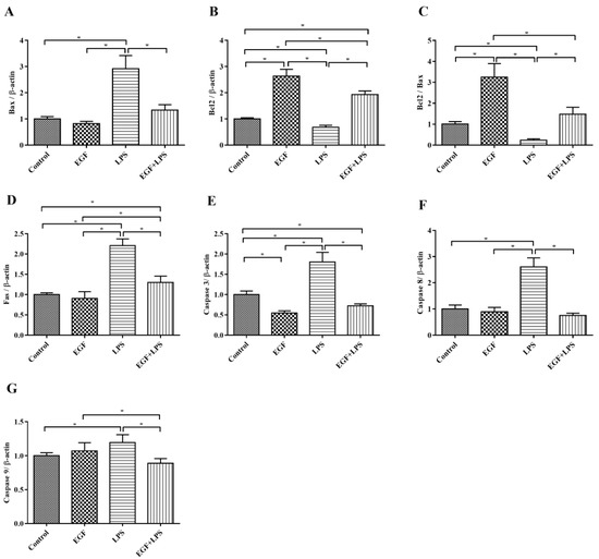 Effects of EGF on pro-apoptotic and anti-apoptotic genes expression induced by LPS. (A) Bax; (B) Bcl2; (C) Bcl2/Bax; (D) Fas; (E) Caspase 3; (F) Caspase 8; (G) Caspase 9. All densitometric values were normalized to β-actin and expressed as a relative level to control value. Data are presented as mean ± SD, n = 3, * p < 0.05.