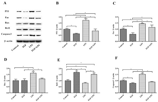Effects of EGF on pro-apoptotic and anti-apoptotic proteins expression induced by LPS. (A) Representative charts of Western blot results; (B) P53; (C) Fas; (D) Bax; (E) Bcl2; (F) Caspase3. Densitometric values were normalized to β-actin and expressed as a relative level to control values. Data are presented as mean ± SD, n = 3, * p < 0.05.