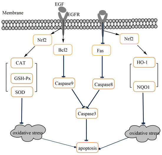 In summary, the present study shows that EGF exhibited potent protective effects on IPEC-J2 cells against LPS-induced cell damage, through enhanced Nrf2-mediated phase II metabolizing enzymes (HO-1 and NQO1) and antioxidative enzymes (SOD, CAT and GSH-Px) expression to alleviate oxidative injury, and then protected IPEC-J2 cells from apoptosis induced by LPS (Figure 8).