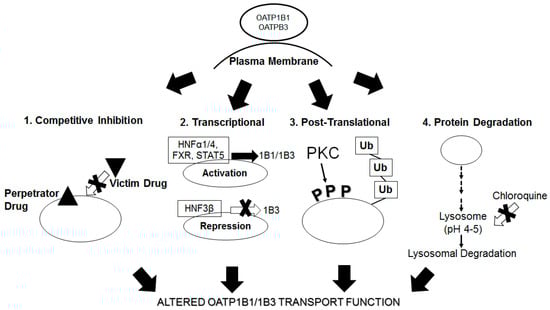 Alam, K.; Crowe, A.; Wang, X.; Zhang, P.; Ding, K.; Li, L.; Yue, W. Regulation of Organic Anion Transporting Polypeptides (OATP) 1B1- and OATP1B3-Mediated Transport: An Updated Review in the Context of OATP-Mediated Drug-Drug Interactions. Int. J. Mol. Sci. 2018, 19, 855. https://doi.org/10.3390/ijms19030855
