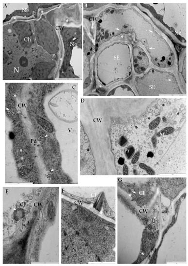- An, Q.; Hückelhoven, R.; Kogel, K.H.; van Bel, A.J.E. Multivesicular bodies participate in a cell wall-associated defence response in barley leaves attacked by the pathogenic powdery mildew fungus. Cell. Microbiol. 2006, 8, 1009–1019. [Google Scholar] [CrossRef] [PubMed]