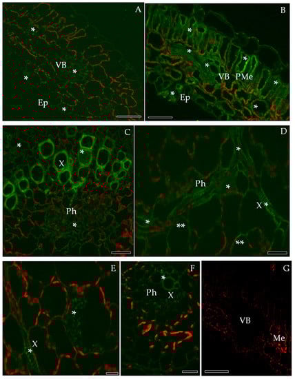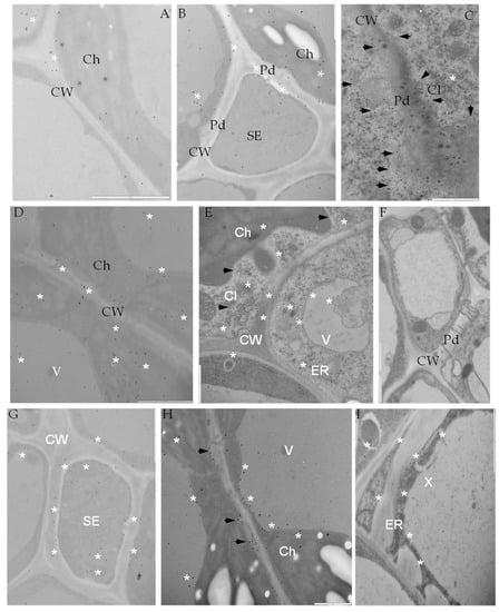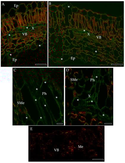 - O’Connell, R.J.; Brown, I.R.; Mansfield, J.W.; Bailey, J.A.; Mazau, D.; Rumeau, D.; Esquerré-Tugayé, M.T. Immunocytochemical localization of hydroxyproline-rich glycoproteins accumulating in melon and bean at sites of resistance to bacteria and fungi. Mol. Plant Microbe Interact. 1990, 3, 33–40. [Google Scholar] [CrossRef]