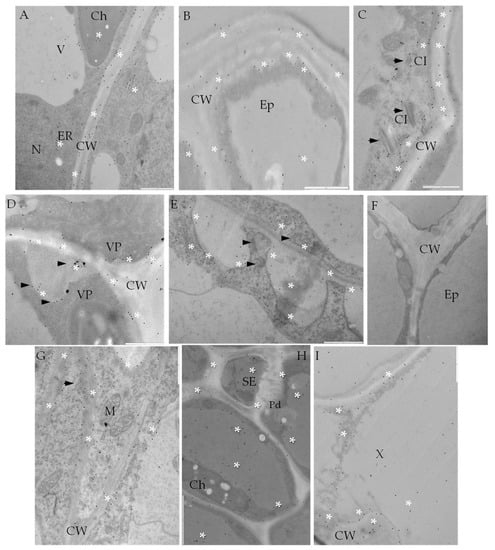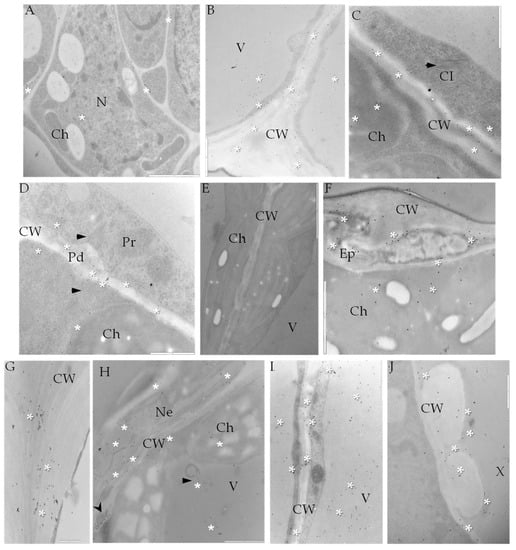 4.5. Statistical Quantification of Tissue and Cell Distribution of Immunogold-Labeled Cell Wall-Associated Proteins PR-2, CesA4 and HRGP (Extensin)