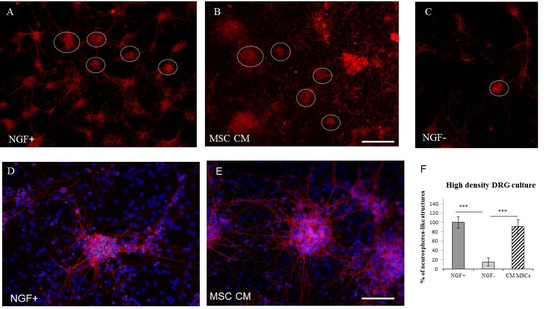 Formation of neurosphere-like structures (shown in white circles) from TUJ1 positive PCDRGs plated in high-density, supplemented: with NGF (A,D); with MScCM (B,E); and without NGF (C). Quantification of neurosphere-like structures (F). *** p < 0.001 indicate significant differences between groups. Scale bars: (A–C) = 400 μm; and (D,E) = 100 μm.