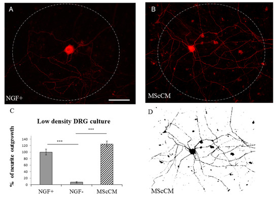 Neurite outgrowth of low-density plated PCDRGs, TUJ1 positive supplemented with: NGF (A); and MScCM (B). Quantification of neurite outgrowth. *** p < 0.001 indicates significant differences between groups (C). The image indicates TUJ1 stained cell with neurites after selecting the area to be analyzed and thresholding the number of pixels covered by the extending neuritis (Image J) (D). *** p < 0.001. Scale bars: (A,B,D) 50 μm.