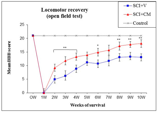 During the initial days post-injury, contusion caused hindlimb paralysis with slight movement in one or two joints in all experimental groups. On following days, the animals in the SCI + CM treatment groups showed a gradual recovery of hindlimb locomotion up to ten weeks after SCI; greater than the recovery in the SCI + V groups, where limited recovery of motor function was noted. The significant locomotor improvement between injured groups without treatment (SCI + V) and treated group (SCI + CM) was detected at two weeks, three weeks, four weeks (** p < 0.01), six weeks (* p < 0.05), 8–10 weeks (** p < 0.01) post-injury with the following BBB scores: 9.2 ± 1.3/two weeks, 11.8 ± 1.5/three weeks, 13.3 ± 1.4/four weeks, 13.9 ± 1.1/five weeks, 14.9 ± 1.4/six weeks, 15.7 ± 1.8/seven weeks, 17.2 ± 1.5/eight weeks, 17.8 ± 1.1/nine weeks, 18.1 ± 1.4/ten weeks (SCI + MScCM); and 4.9 ± 1.4/two weeks, 6.2 ± 1.9/three weeks, 8.8 ± 1.4/four weeks, 11.2 ± 1.2/five weeks, 10.7 ± 1.4/six weeks, 11.7 ± 1.9/seven weeks, 13.1 ± 1.3/eight weeks, 13.3 ± 1.6/nine weeks, 13.1 ± 1.2/ten weeks (SCI + V) (Figure 3).