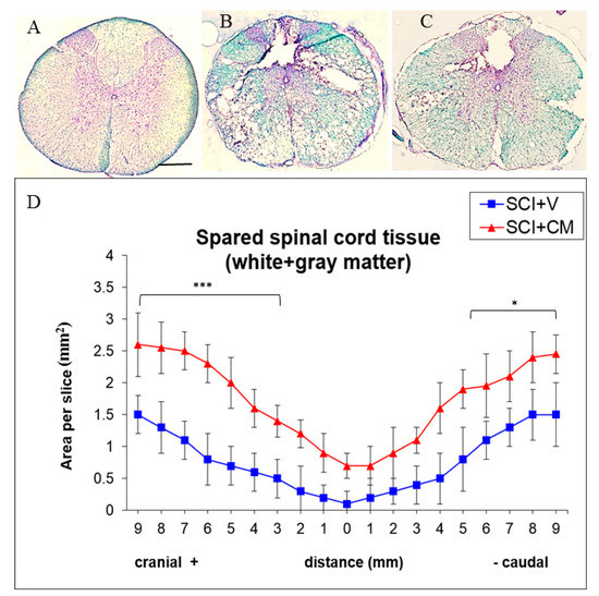 Representative cross section of spinal cord, Th8 stained with luxol fast blue of: control (A); SCI treated with vehicle (SCI + V) (B); and treated with MScCM (SCI + CM) (C). Quantitative stereological analyses of tissue fenestration in 1.8 cm (0.9+/−) segment (D). Note, there are significant differences of spared tissue (gray and white matter) between SCI + V (blue line) and SCI + CM (red line) treatment in most cranial and caudal sections (*** p < 0.001, * p < 0.05). Scale bars (A–C) = 500 μm.