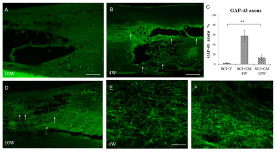 Immunohistochemistry revealing the presence of GAP-43-positive axons located in: lesion (B, arrows indicate highest positivity), the rostral (E), and caudal segments (F) in SCI + CM after four weeks. Note the significant decrease of GAP-43 fibers at ten weeks (D, arrows indicate occasional positive axons), and no expression in SCI + V group (A). Quantification of GAP-43-positive axons between groups (C) ** p < 0.01. Scale bars: (A,B,D) 400 μm; and (E,F) 150 μm.