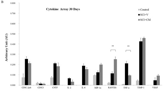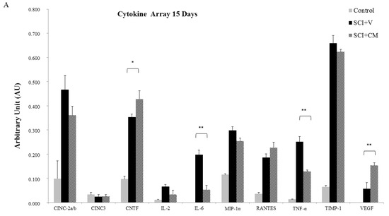 Chemokines and cytokines array after SCI in conditioned media from following groups: Control, SCI + V, SCI + CM. Comparison of cytokines and chemokines secretion at: 15 days (A); and 30 days (B) in studied groups. Bar diagrams represent the ratio of the spot mean pixel densities/reference point pixel densities. Statistical significance indicated by * p < 0.05, ** p < 0.01.
