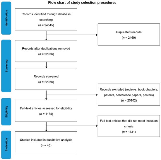 Searching the selected databases with the keywords mentioned in the methodology yielded 24,545 records. After screening, the total number of articles removed was 24,502, which included; (a) 20,902 reviews, book chapters and patents, (b) 2469 duplicates, (c) 1131 which did not meet inclusion criteria (Figure 1). Forty-three eligible articles were included, compiled in Table 1 and discussed in this systematic review.