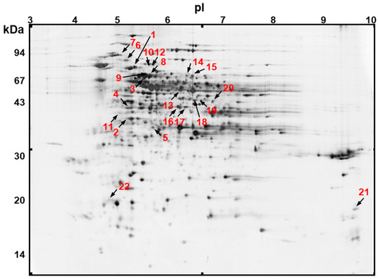 Position of varying spots on 2D silver-stained master gel of cauliflower curd mitochondrial proteome (in total 100 µg of mitochondrial proteins pooled from all experimental variants), including 694 repeatable spots. 24-cm immobilised pH gradient strips (linear pH 3–10) for the first dimension and precast Ettan DALT 12.5% SDS-polyacrylamide gels for the second dimension were used. It shows the position of the 22 variable spots that were mapped and identified (they appear also in Figure 1, Figure S1 and S2 and Table 1). Protein molecular mass standards (Thermo Scientific, Gdańsk, Polska) sizes are given in kilodaltons (kDa); pI-isoelectric point. Further experimental details in Materials and Methods.
