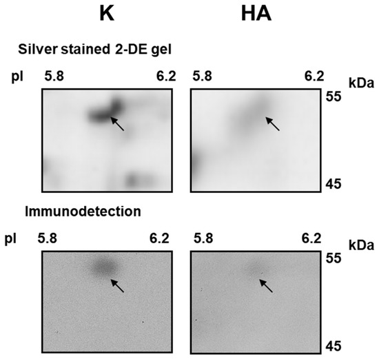 Immunoblotting of ATP1 on 2D blots containing cauliflower curd mitochondrial proteins from control grown plants (K) and from heat-recovered plants (HA). 100 μg of mitochondrial proteins were loaded onto all gels. 24-cm immobilized pH gradient strips (linear pH 3–10) for the first dimension and precast Ettan DALT 12.5% SDS-polyacrylamide gels for the second dimension were used. For protein transfer onto Immobilone membrane, a semidry system was applied. Blots were probed with polyclonal antibodies raised against mitochondrial ATP synthase subunit α (ATP1). Detection was carried with chemiluminescence assays after incubation with HRP-conjugated secondary antibody. Representative results (from triplicates) are shown. For the comparison, panels showing fragments of silver-stained 2D gels that contains spots for ATP1 are displayed. Arrows (indicated in each blot) show the position of ATP1 on immunoblots and 2D gels. Protein molecular mass standard (Thermo Scientific, Gdańsk, Poland) sizes are given in kilodaltons (kDa); pI-isoelectric point. Further experimental details in the text.