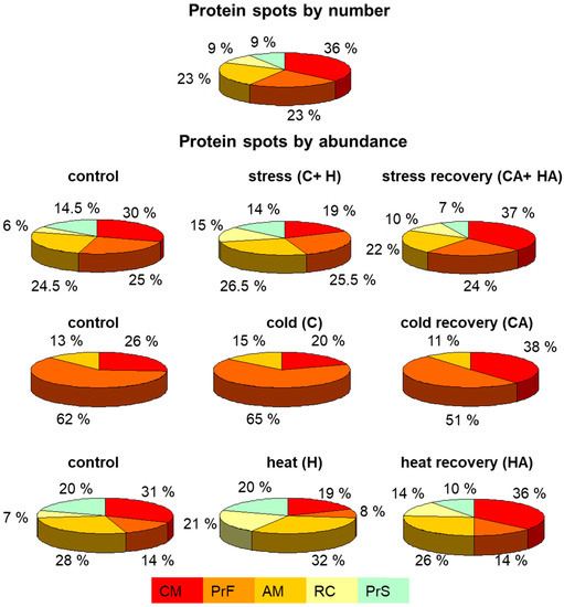 Spots linked to RC components increased in abundance after heat stress, as well as after heat recovery, however, the ones linked to amino acid metabolism were upregulated after cold and heat stress. In contrast, spots linked with carbohydrate metabolism decreased in abundance after cold and heat, but markedly upregulated in cold- and heat-recovered plants (Figure 3, panel: protein spots by abundance), Interestingly, the total abundance of spots related to the protein fate showed some increase after cold, but neither after heat stress (where it was decreased), nor after recovery phase. It seems that the majority of identified protein spots that belonged to the protein fate class appeared responsive in cold stress and cold recovery, which indicates its overall importance in low temperature response in cauliflower mitochondria. Many protein functional classes, however, were regulated by heat and heat recovery (Figure 3, panel: protein spots by abundance, at the bottom).