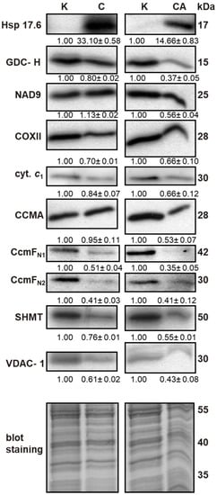 Immunoblotting of proteins from control grown plants (K), cold-stressed plants (C) and from cold-recovered plants (CA). About 10 μg of mitochondrial proteins from cauliflower curds were loaded onto SDS-polyacrylamide gels. Proteins were transferred onto an Immobilone membrane using a semidry system. All assays were performed using specific primary antibodies raised against heat shock protein 17.6C class I (Hsp17.6), glycine decarboxylase subunit H (GDC-H), NADH dehydrogenase (CI) subunit 9 (NAD9), cyt. c oxidase (CIV) subunit 2 (COXII), cyt. c1, cyt. c maturation proteins (CCMA, CcmFN1, CcmFN2), serine hydroxymethyltransferase 1 (SHMT) and voltage-dependent anion channel 1 (VDAC-1). Detection was carried out with chemiluminescence assays after incubation with HRP-conjugated secondary antibody. Representative results from triplicates are shown. The relative abundance of bands is given below each panel. The abundance in stress conditions (value ± SD) is standardized to 1.00 in control variants. For the loading control, blot staining with Coomassie Brilliant Blue is additionally shown. Protein molecular mass standard (Thermo Scientific, Gdańsk, Poland) sizes are given in kilodaltons (kDa). Further experimental details in Materials and Methods.
