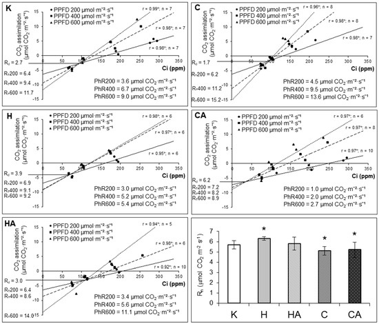 Changes in cauliflower leaf light (Rd), dark (Rn) respiration as well as total light (RT) respiration and (PhR) photorespiration (all expressed in µmol CO2·m−2·s−1) at 200 (RT200 and PhR200), 400 (RT400 and PhR400) and 600 (RT600 and PhR600) µmol·m−2·s−1 illumination rate in control grown (K), heat-stressed (H), heat-recovered (HA), cold-stressed (C) and cold-recovered (CA) plants. All parameters were measured on 3-month-old plants with fully developed leaves with the application of an infrared gas analyser. Data were recorded after at least 2 h of illumination. During the experiment, each of the analysed leaves were placed into a 6-cm2 chamber of the analyser. Results were recorded after initial leaf acclimation to the desired light and CO2 concentration, relative humidity and temperature. The Rd rate was determined according to the Laisk [55] method. The photorespiration rate for each PPFD value was determined as the difference between RT and Rd values. Error bars denote ± S.D. Asterisks indicate significantly different curves at p = 0.05 (Student’s t-test). Further experimental details in Materials and Methods.
