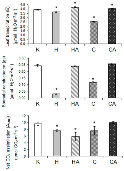 Changes in cauliflower leaf transpiration, stomatal conductance to water vapour and net CO2 assimilation rate at 400 μmol·m−2·s−1 illumination in control grown (K), cold-stressed (C), heat-stressed (H), cold-recovered (CA) and heat-recovered (HA) plants. All parameters were measured on 3-month-old plants with fully developed leaves with the application of an infrared gas analyser. Data were recorded after at least 2 h of illumination. During the experiment, each of the analysed leaves were placed into a 6-cm2 chamber of the analyser. Results were recorded after initial leaf acclimation to the desired light and CO2 concentration, relative humidity and temperature. Bars are means ± SD (n > 3) and asterisks indicate significant differences (p < 0.05; Student’s t-test) from the control (K). Further experimental details in Materials and Methods.