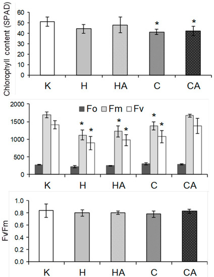 Changes in cauliflower leaf chlorophyll content minimal (Fo), maximal (Fm) and variable (Fv) fluorescence and Fv/Fm ratio in control grown (K), cold-stressed (C), heat-stressed (H), cold-recovered (CA) and heat-recovered (HA) plants. Chlorophyll content measured with a chlorophyll meter was expressed in relative units. Chlorophyll fluorescence was measured using a portable fluorometer. Before measurement, leaves were dark adapted for 30 min. Photochemical efficiency of PSII could be estimated from the Fv/Fm ratio, where Fv is the difference between Fm and Fo. Bars are means ± SD (n > 3) and asterisks indicate significant differences (p < 0.05; Student’s t-test) from the control (K). Further experimental details in ‘Materials and Methods’.